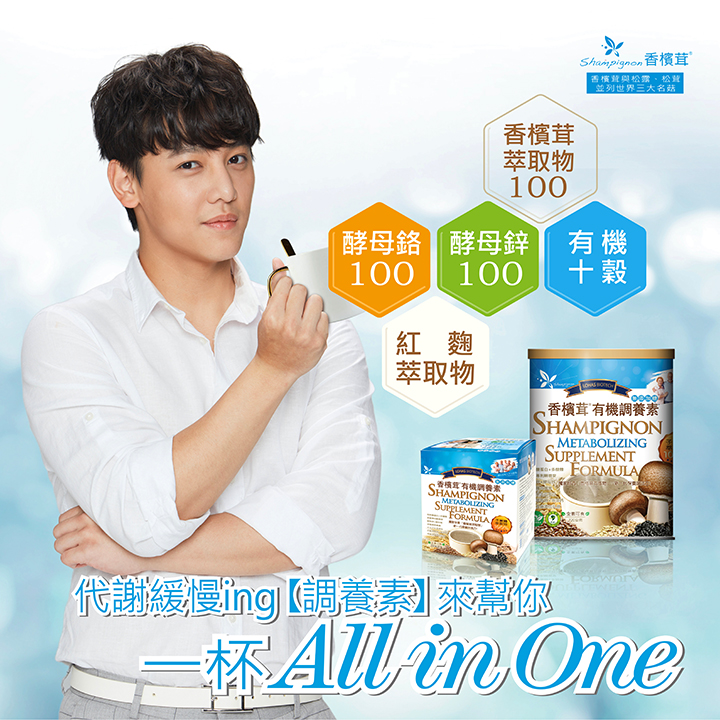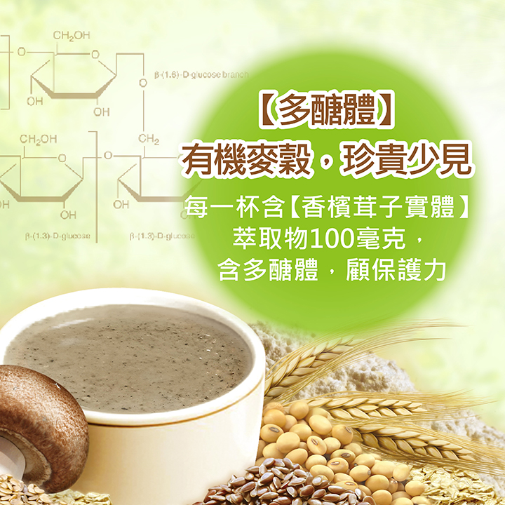 - 內容成分有機燕麥(澳洲)、有機黃豆(美國/加拿大)、有機糙米(臺灣)、有機黑豆、有機黑糯米、有機黑麥、有機黑芝麻、有機小米、有機亞麻仁籽、大豆胜肽、白芝麻、有機海藻鈣、大麥萃取物(含轉糖麥)、紅麴萃取物、香檳茸萃取物(Agaricus blazei Murill 純淨牧草全環控固態培養)、酵母鋅(非活性酵母、氧化鋅)、酵母鉻(非活性酵母、氯化鉻)