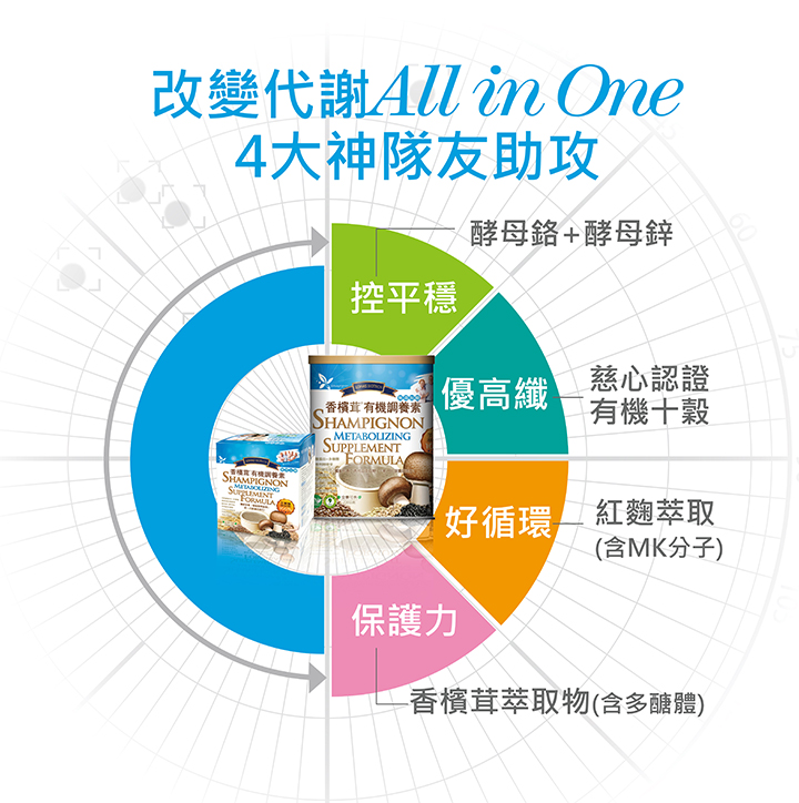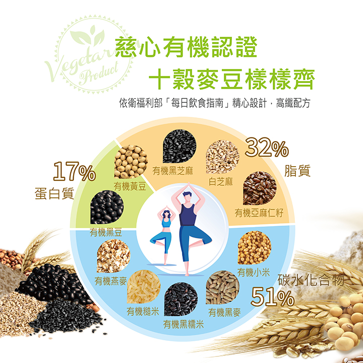 - 內容成分有機燕麥(澳洲)、有機黃豆(美國/加拿大)、有機糙米(臺灣)、有機黑豆、有機黑糯米、有機黑麥、有機黑芝麻、有機小米、有機亞麻仁籽、大豆胜肽、白芝麻、有機海藻鈣、大麥萃取物(含轉糖麥)、紅麴萃取物、香檳茸萃取物(Agaricus blazei Murill 純淨牧草全環控固態培養)、酵母鋅(非活性酵母、氧化鋅)、酵母鉻(非活性酵母、氯化鉻)
