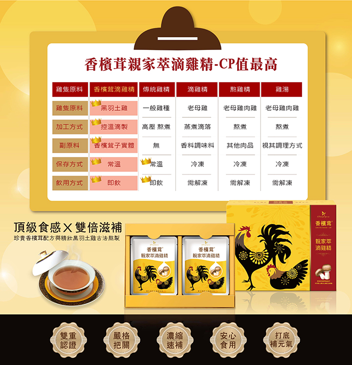 - 內容成分全雞、鮮採香檳茸子實體(Agaricus blazei Murill 純淨牧草全環控固態培養)